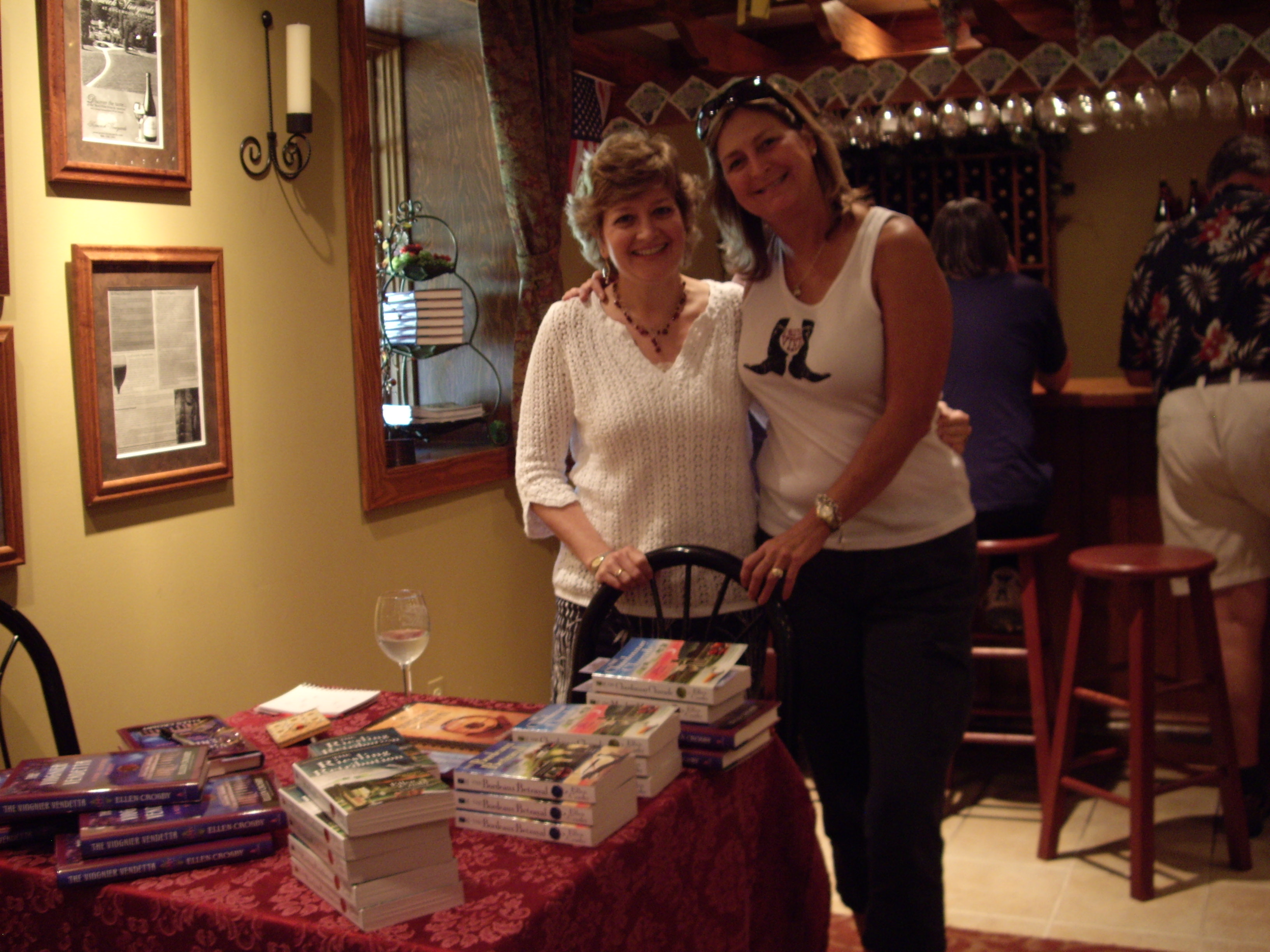 What fun! Leave it to Keswick Vineyards to make everyone feel at home in what could be an otherwise stuffy environment. Ellen Crosby, was approachable and friendly, signing her new book,THE VIOGNIER VENDETTAas Keswick released with anticipation their 2009 Viognier Estate Reserve! Ellen combines history, wine making and our locale to create a suspenseful romantic tale for oenophiles and mystery lovers alike. We purchased a bottle and her book, but, in retrospect should have bought more of her books and more of the Viognier! Her previous novel, The Riesling Retributionwas selected as one of 5 finalists for the 7th Annual People’s Choice Awards sponsored by the Library of Virginia. Afterthoughts…we did take home their 2009 Norton and enjoyed it with an appetizer watching our favorite non- home grown team, The Dallas Cowboys. If we hadn’t taped the game, we might have stayed long enough to adopt one of the adorable schnauzer-beagle mix puppies featured at Yappy Hours!